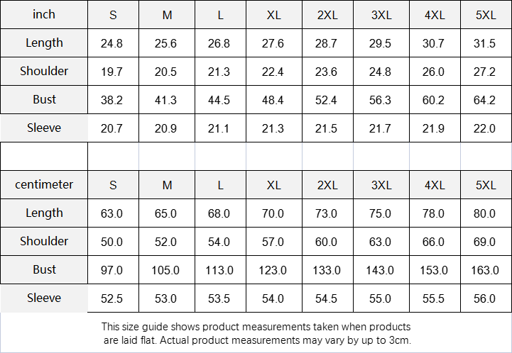 | Centimeter | S | M | L | XL | 2XL | 3XL | 4XL | 5XL |